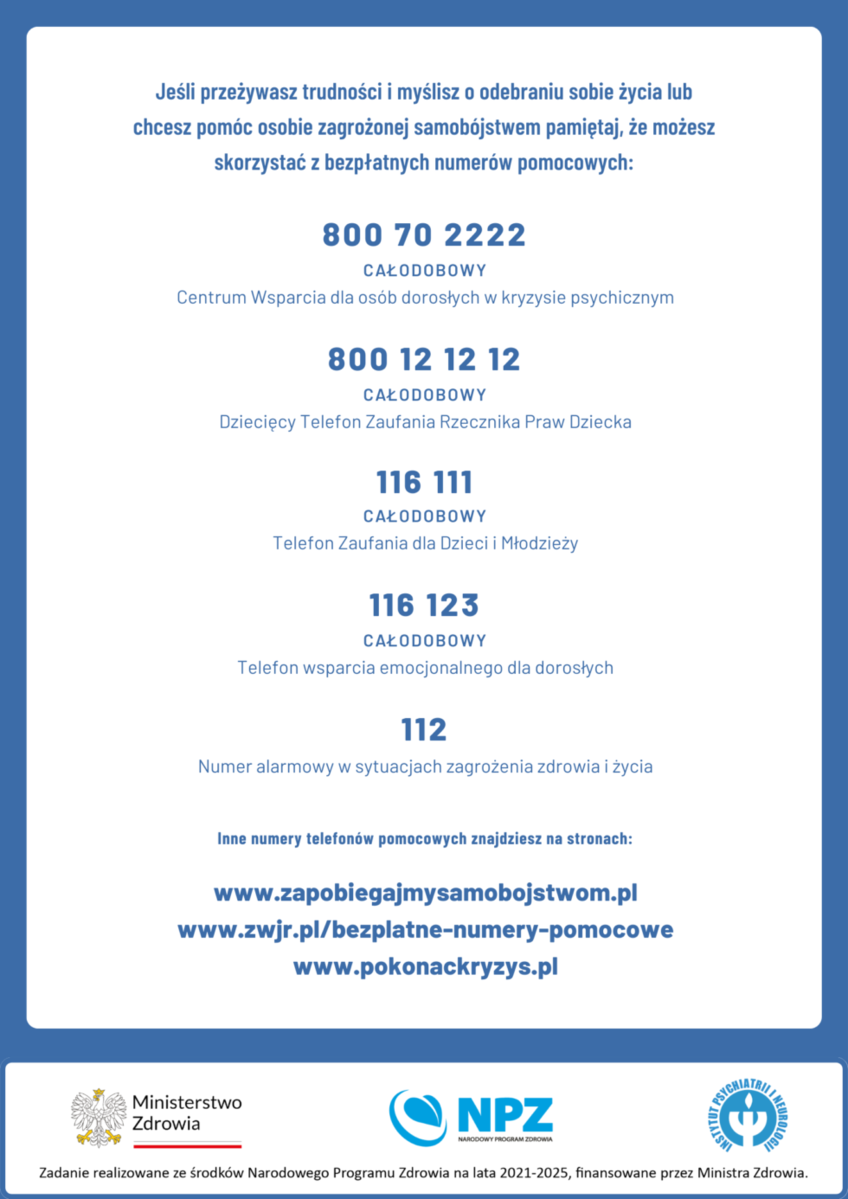 Pamiętajmy, że każdy z nas może kiedyś zetknąć się z osobą, która znajduje się w bardzo złym stanie emocjonalnym. Osobie takiej musimy udzielić wsparcia, które być może uratuje jej życie. Zaproponujmy takiej osobie nawiązanie kontaktu ze specjalistami. Przypominamy, że na terenie każdej miejscowości znajdują się instytucje pomocowe, między innymi miejskie i gminne ośrodki pomocy rodzinie, ośrodki interwencji kryzysowej oraz ośrodki pomocy społecznej czy poradnie psychologiczne, których pracownicy są gotowi pomóc w rozwiązaniu trudnych sytuacji życiowych i zapobiec tragicznym w skutkach wydarzeniom.