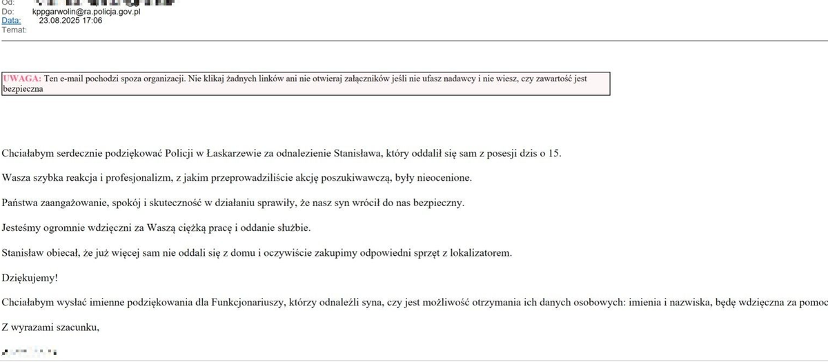 Do Komendy Powiatowej Policji w Garwolinie dotarł również e-mail z podziękowaniami, w którym matka chłopca wyraziła wdzięczność za profesjonalizm policjantów.