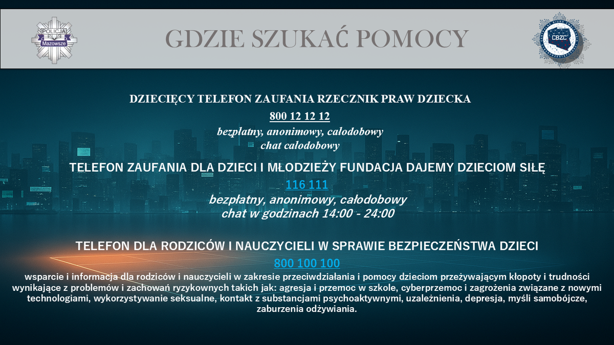 Kampania rozpoczęła się w październiku br. i będzie realizowana do czerwca 2026 r. na terenie garnizonu mazowieckiego. Beneficjentami są uczniowie w wieku 11 - 18 lat, nauczyciele i pedagodzy, psycholodzy szkolni z placówek oświatowych rodzice i opiekunowie, policjanci ds. profilaktyki społecznej, nieletnich i patologii.