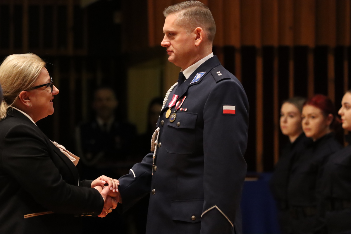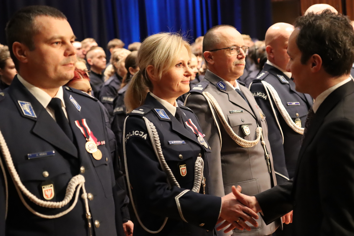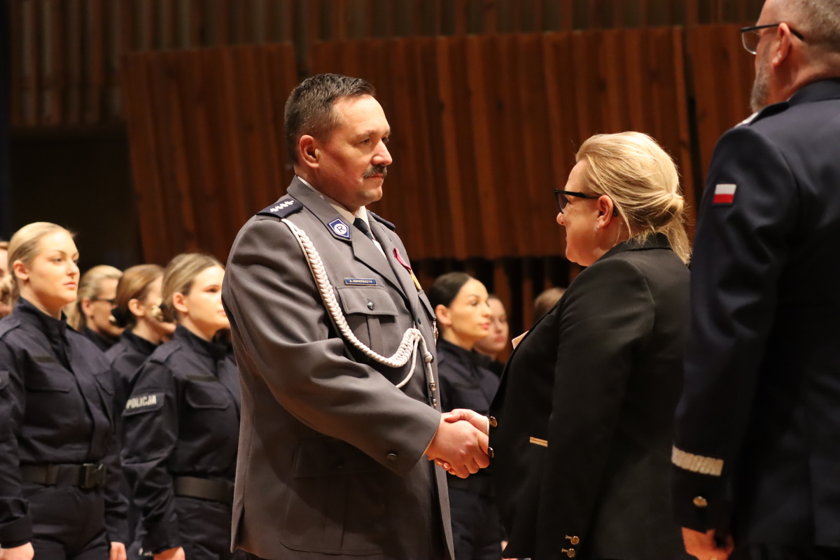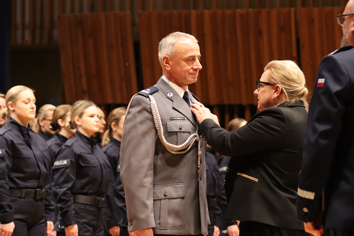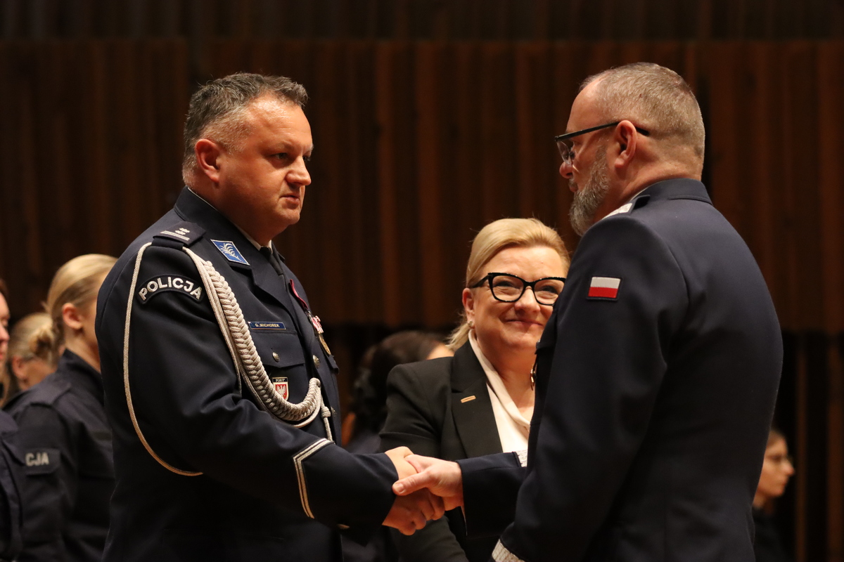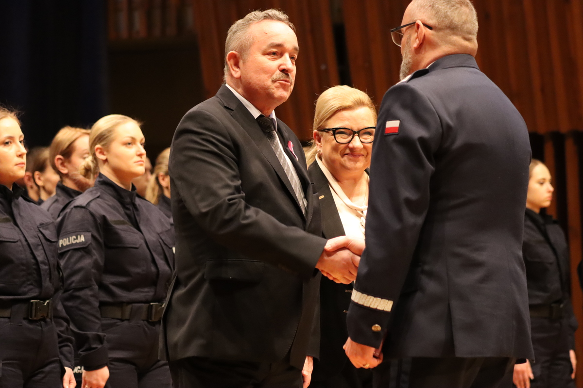 Dzisiejsza uroczystość to dwa ważne wydarzenia. Z jednej strony uhonorowaliśmy za nienaganną służbę ojczyźnie wielu policjantów, za co Wam serdecznie dziękuję. Z drugiej przyjmujemy w szeregi nowych funkcjonariuszy i nowe funkcjonariuszki. Zarówno jednej, jak i drugiej grupie należą się dzisiaj ukłony, słowa gratulacji i podziękowań, bo to Wy wzięliście lata temu, albo bierzecie właśnie dzisiaj na swoje barki ogromną odpowiedzialność za życie i zdrowie naszych obywateli, za ład publiczny, za przestrzeganie prawa. Służba w Policji to niełatwa praca wymagająca i często niedoceniona, ale Wy dzisiaj macie dobre wzorce, aby brać z nich przykład. Macie doświadczonych funkcjonariuszy, z których możecie być dumny, możecie oddawać im szacunek i uczyć się od nich, bo naprawdę jest od kogo.