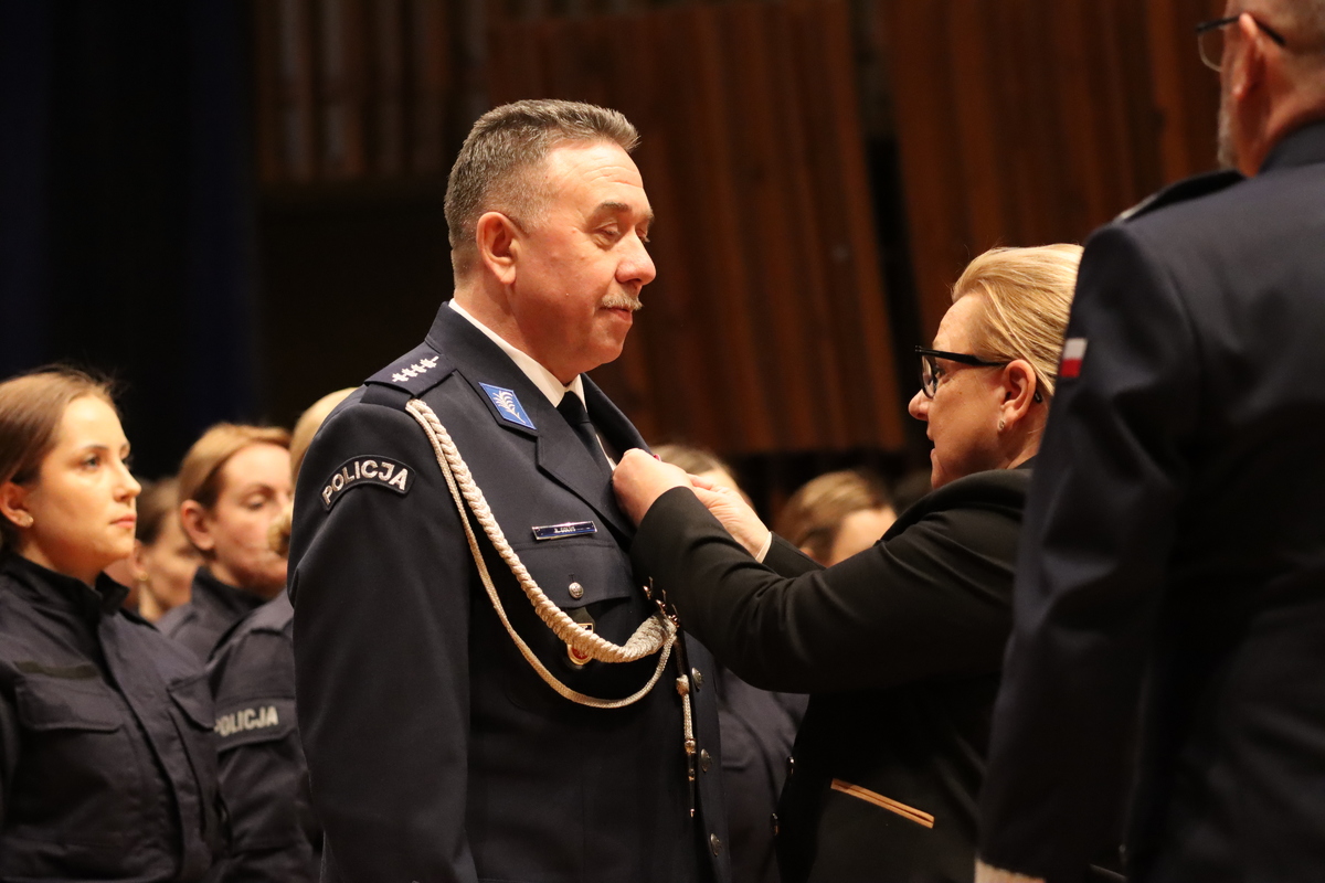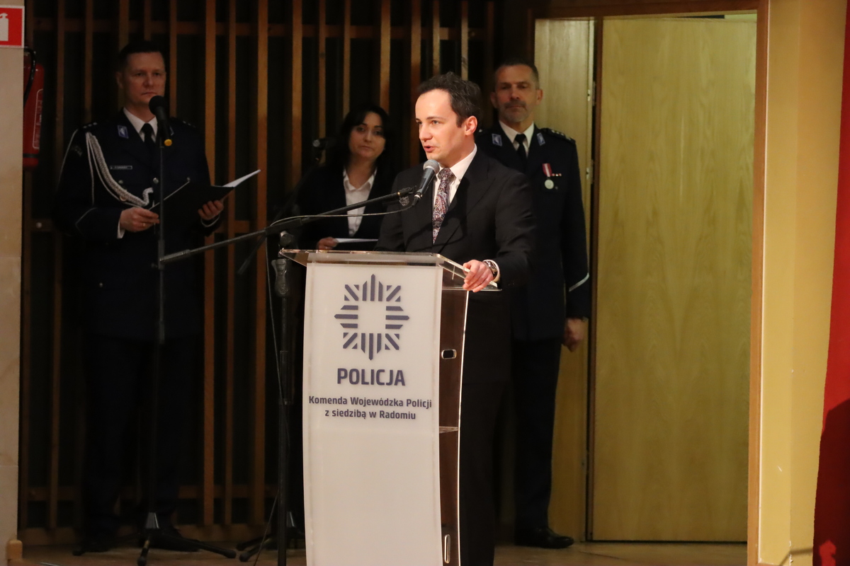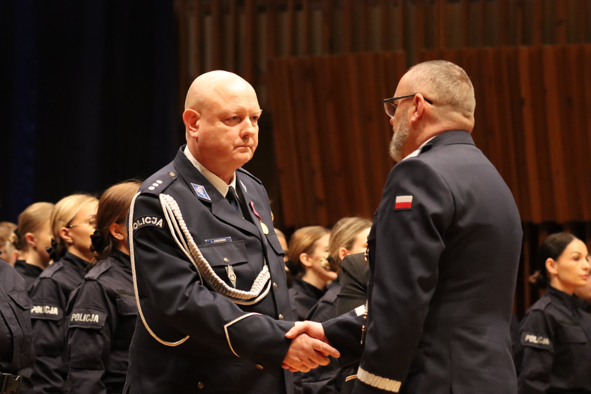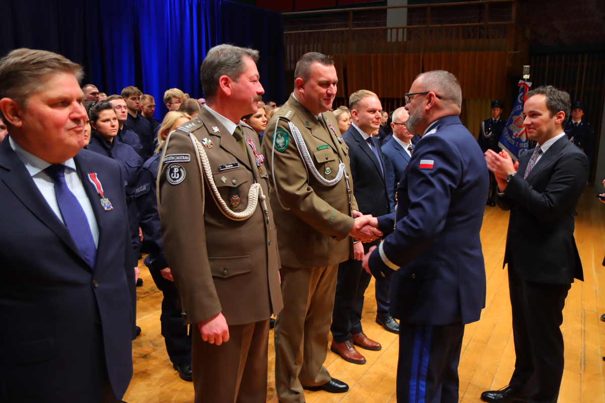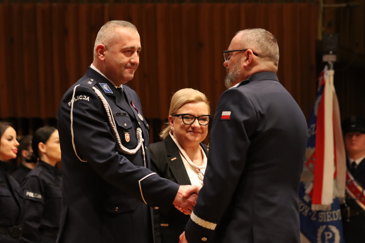 Dzisiejsza uroczystość to dwa ważne wydarzenia. Z jednej strony uhonorowaliśmy za nienaganną służbę ojczyźnie wielu policjantów, za co Wam serdecznie dziękuję. Z drugiej przyjmujemy w szeregi nowych funkcjonariuszy i nowe funkcjonariuszki. Zarówno jednej, jak i drugiej grupie należą się dzisiaj ukłony, słowa gratulacji i podziękowań, bo to Wy wzięliście lata temu, albo bierzecie właśnie dzisiaj na swoje barki ogromną odpowiedzialność za życie i zdrowie naszych obywateli, za ład publiczny, za przestrzeganie prawa. Służba w Policji to niełatwa praca wymagająca i często niedoceniona, ale Wy dzisiaj macie dobre wzorce, aby brać z nich przykład. Macie doświadczonych funkcjonariuszy, z których możecie być dumny, możecie oddawać im szacunek i uczyć się od nich, bo naprawdę jest od kogo.