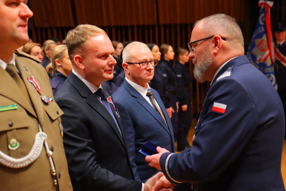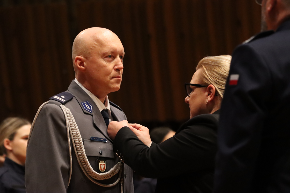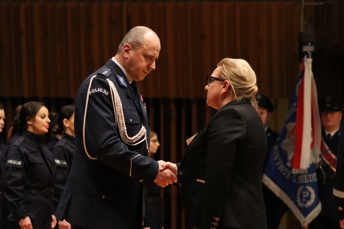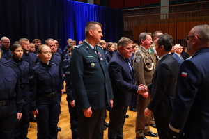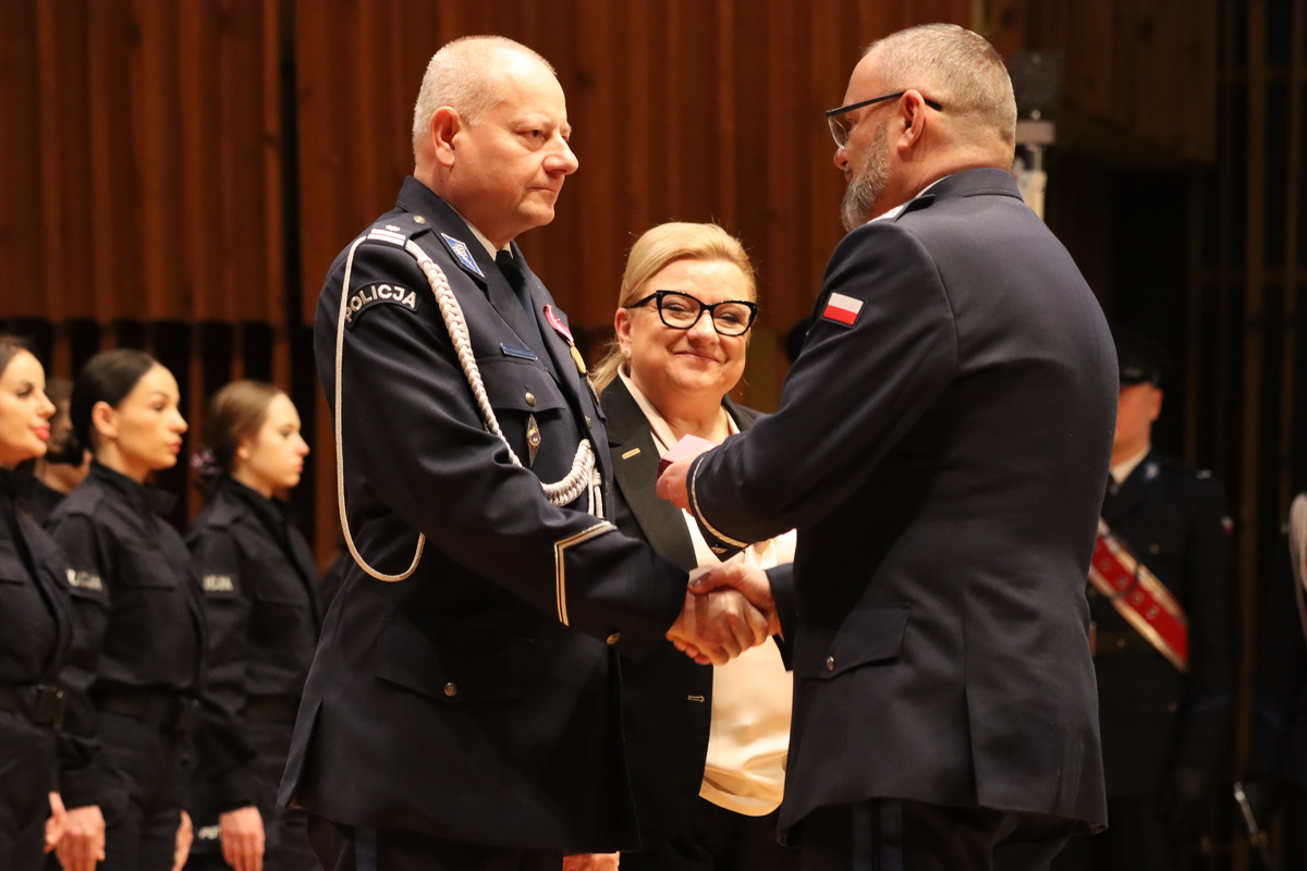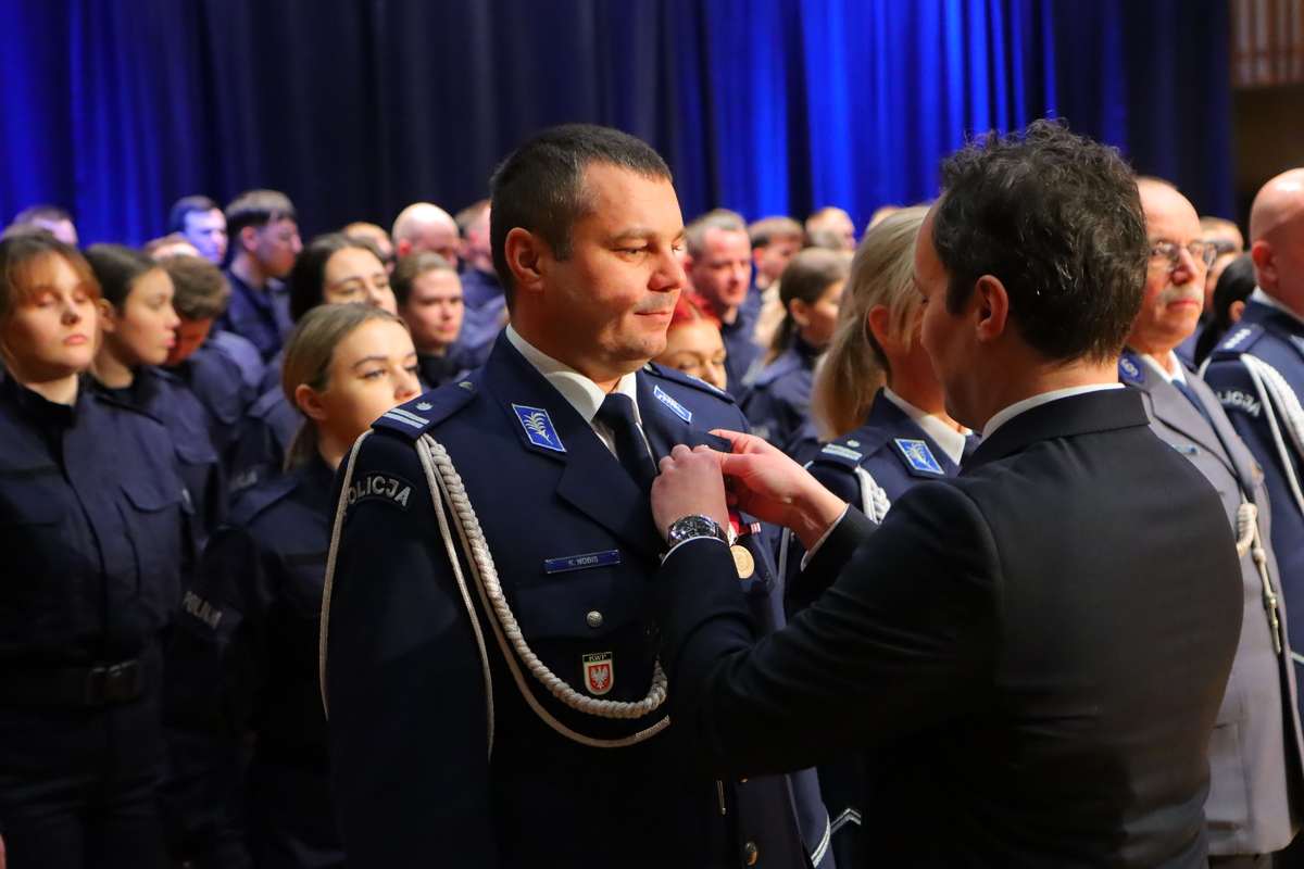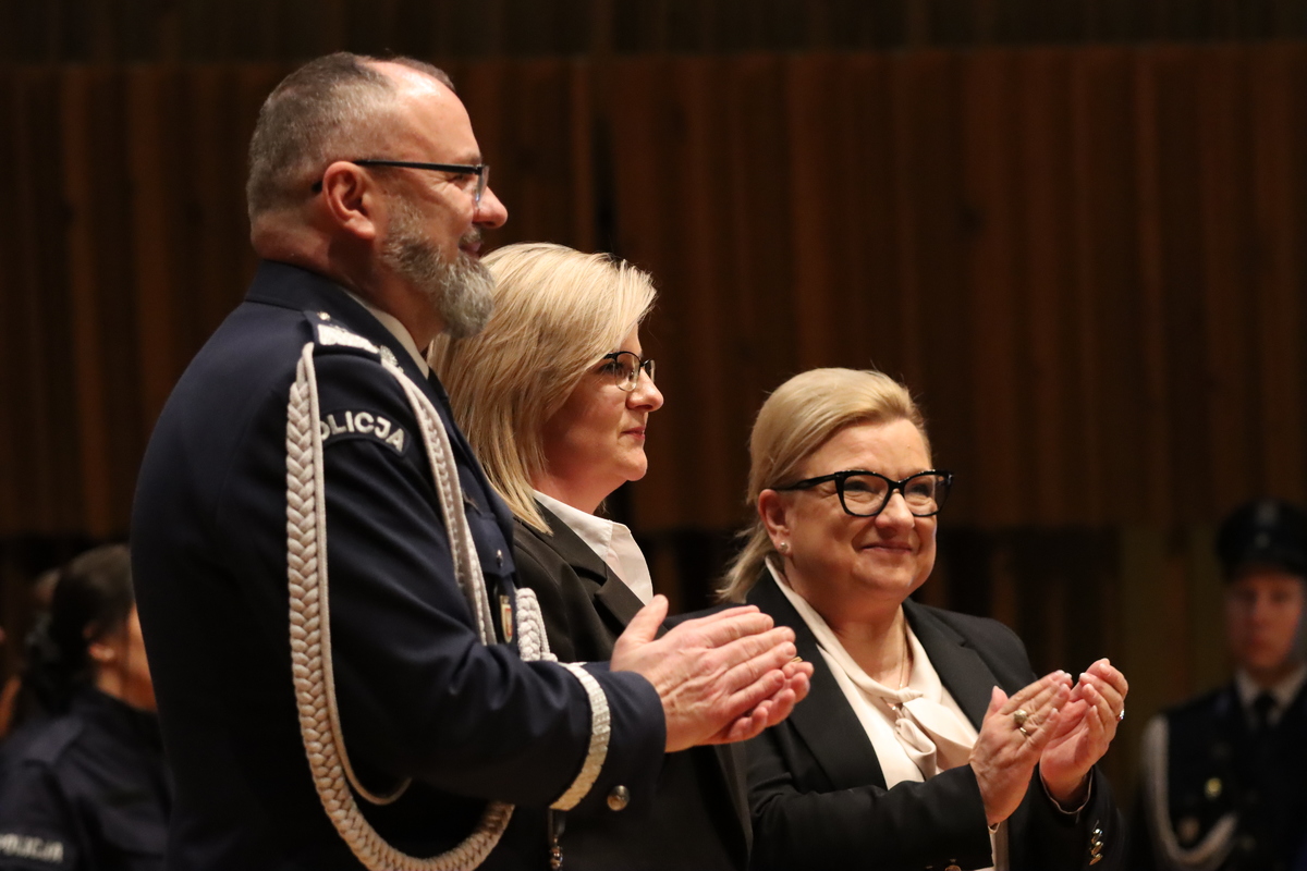 Dzisiejsza uroczystość to dwa ważne wydarzenia. Z jednej strony uhonorowaliśmy za nienaganną służbę ojczyźnie wielu policjantów, za co Wam serdecznie dziękuję. Z drugiej przyjmujemy w szeregi nowych funkcjonariuszy i nowe funkcjonariuszki. Zarówno jednej, jak i drugiej grupie należą się dzisiaj ukłony, słowa gratulacji i podziękowań, bo to Wy wzięliście lata temu, albo bierzecie właśnie dzisiaj na swoje barki ogromną odpowiedzialność za życie i zdrowie naszych obywateli, za ład publiczny, za przestrzeganie prawa. Służba w Policji to niełatwa praca wymagająca i często niedoceniona, ale Wy dzisiaj macie dobre wzorce, aby brać z nich przykład. Macie doświadczonych funkcjonariuszy, z których możecie być dumny, możecie oddawać im szacunek i uczyć się od nich, bo naprawdę jest od kogo.