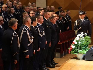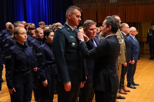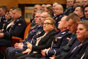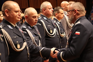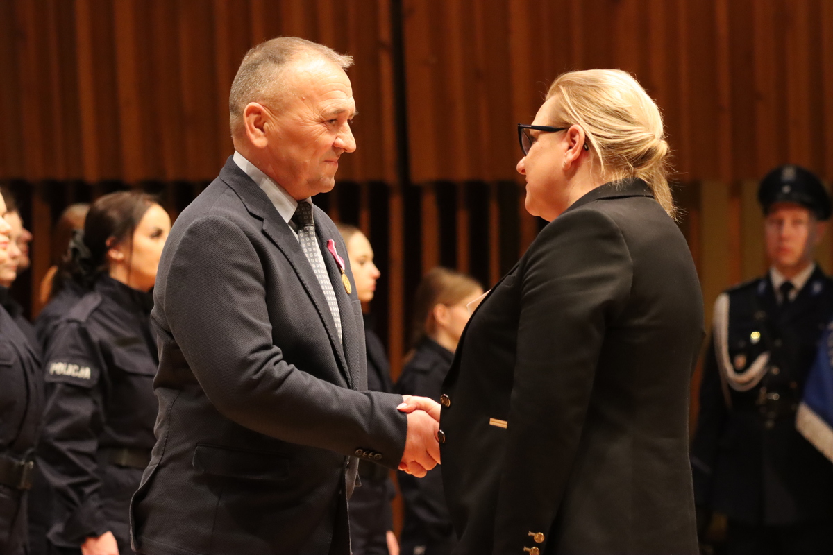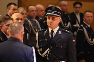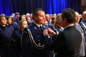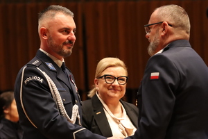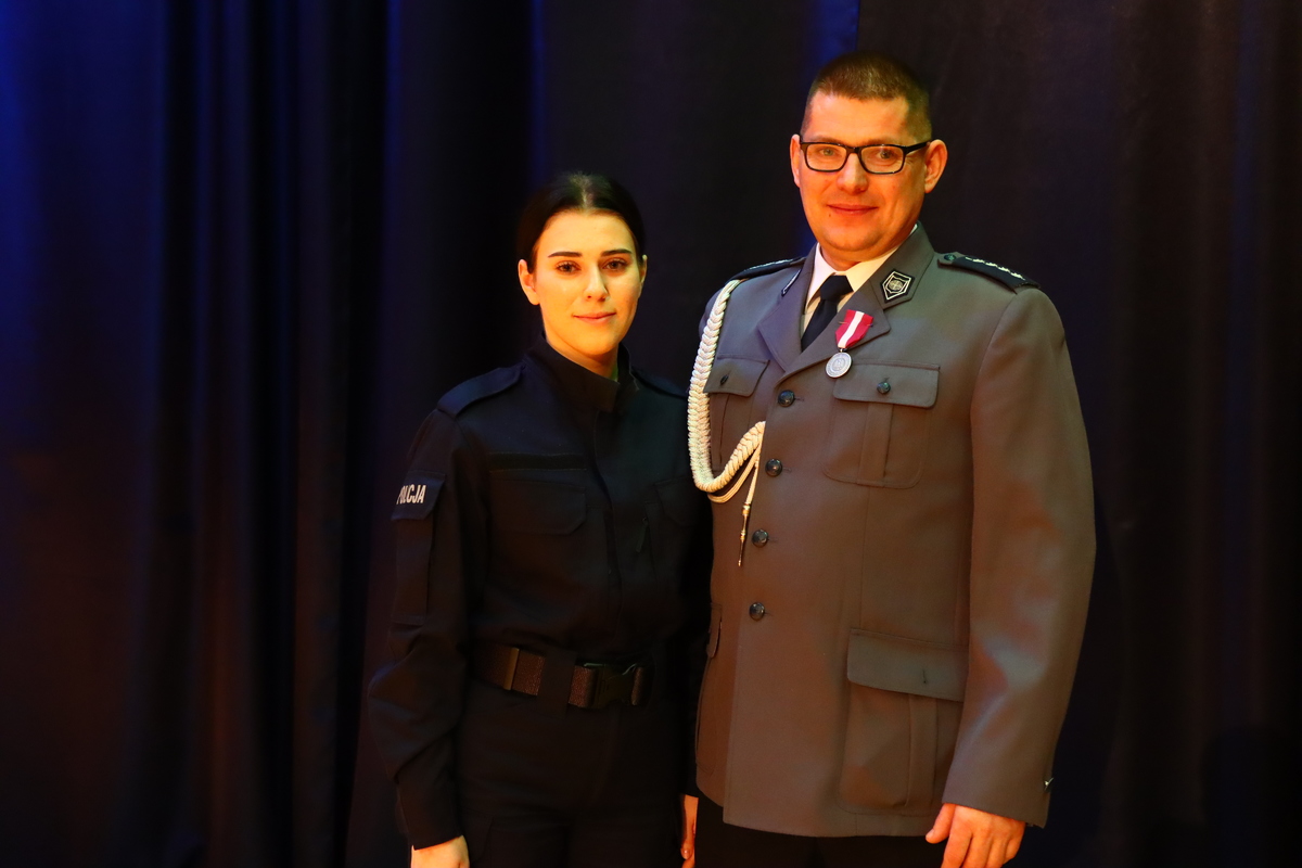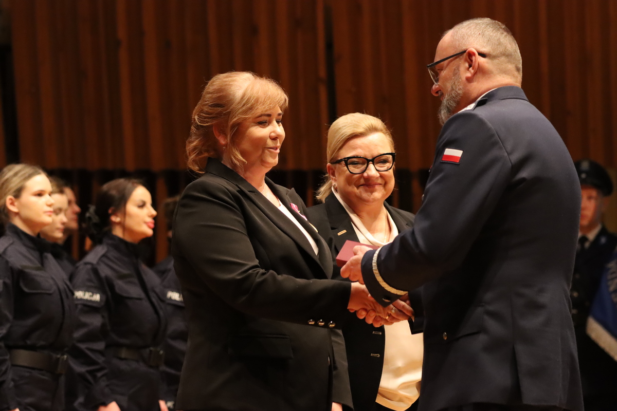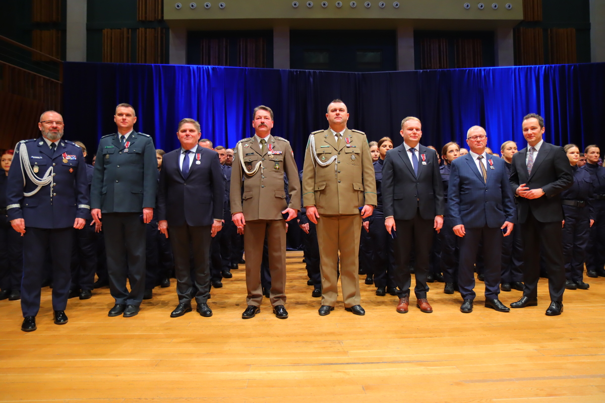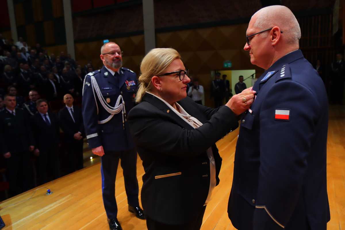 Dzisiejsza uroczystość to dwa ważne wydarzenia. Z jednej strony uhonorowaliśmy za nienaganną służbę ojczyźnie wielu policjantów, za co Wam serdecznie dziękuję. Z drugiej przyjmujemy w szeregi nowych funkcjonariuszy i nowe funkcjonariuszki. Zarówno jednej, jak i drugiej grupie należą się dzisiaj ukłony, słowa gratulacji i podziękowań, bo to Wy wzięliście lata temu, albo bierzecie właśnie dzisiaj na swoje barki ogromną odpowiedzialność za życie i zdrowie naszych obywateli, za ład publiczny, za przestrzeganie prawa. Służba w Policji to niełatwa praca wymagająca i często niedoceniona, ale Wy dzisiaj macie dobre wzorce, aby brać z nich przykład. Macie doświadczonych funkcjonariuszy, z których możecie być dumny, możecie oddawać im szacunek i uczyć się od nich, bo naprawdę jest od kogo.