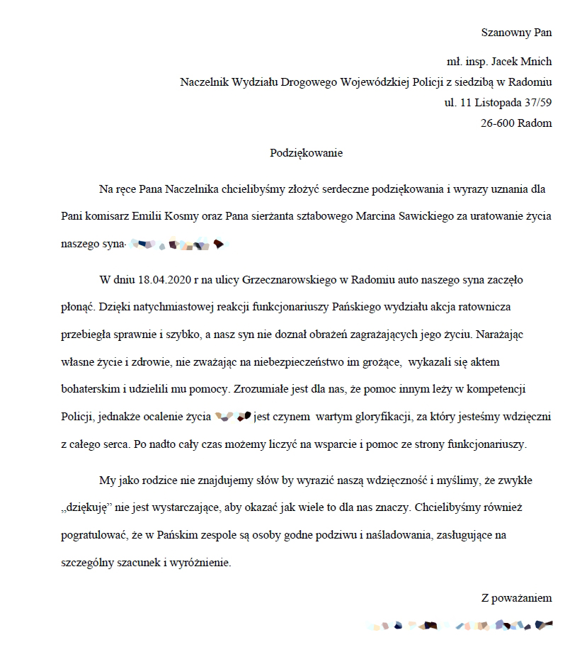 "My jako rodzice nie znajdujemy słów, by wyrazić naszą wdzięczność i myślimy, że zwykłe „dziękuję”, nie jest wystarczające, aby okazać, jak wiele to dla nas znaczy" - tym słowami dziękują policjantom z Wydziału Ruchu Drogowego KWP zs. w Radomiu rodzice mężczyzny, którego policjanci uratowali z płonącego auta.