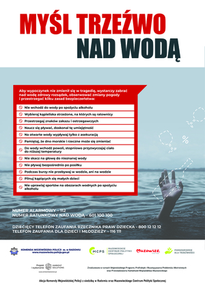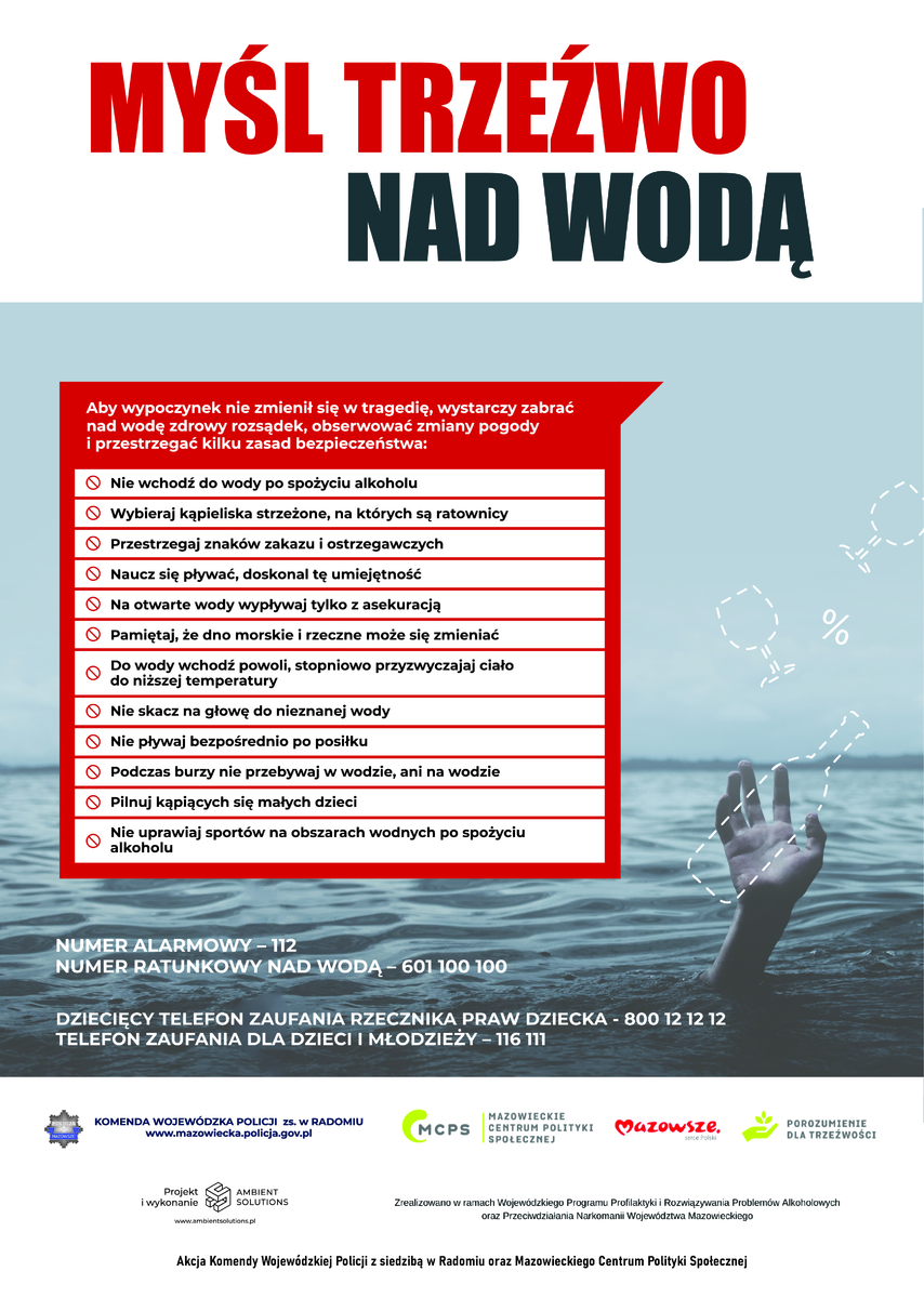 - przebywając nad wodą, zwracajmy uwagę na osoby obok nas. Może okazać się, że ktoś będzie potrzebował naszej pomocy. Jeśli będziemy w stanie mu pomóc, to zróbmy to, ale w granicach swoich możliwości. Jeśli nie będziemy czuli się na siłach, to niezwłocznie zaalarmujmy służby oraz inne osoby.