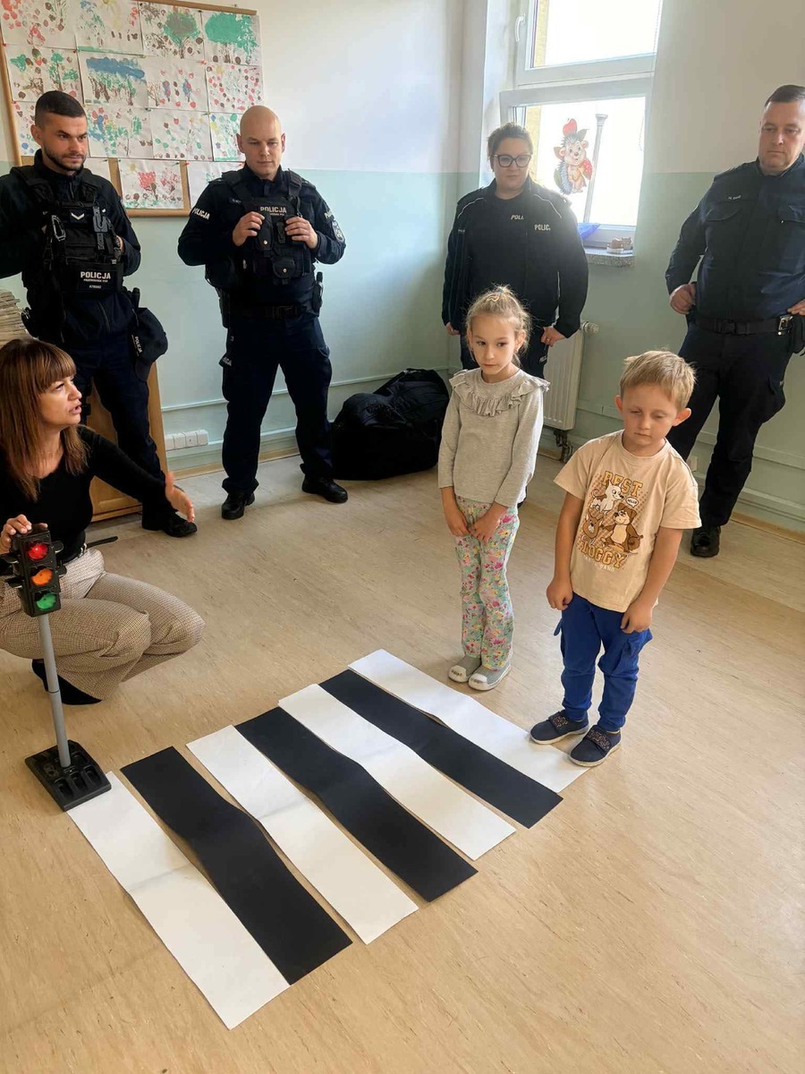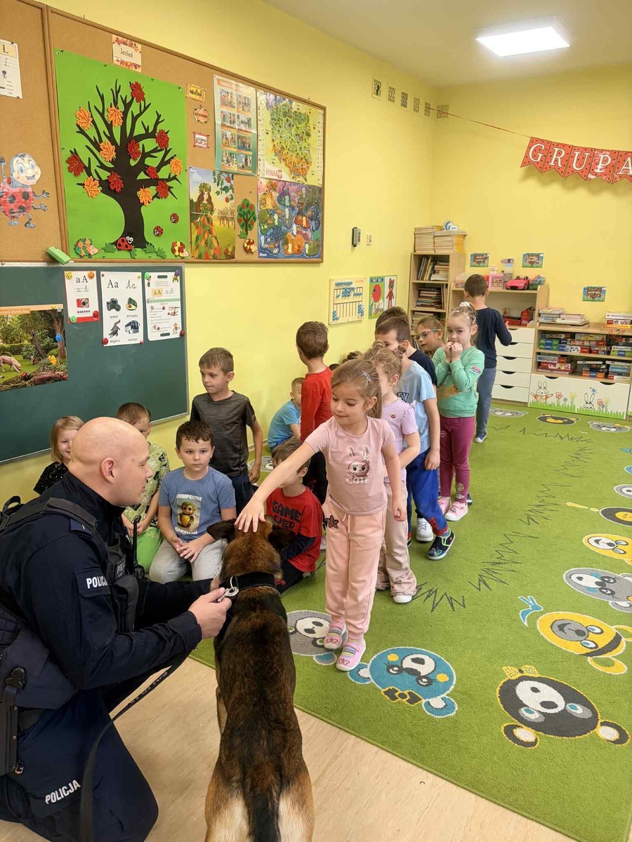 Nie zabrakło także praktycznej części spotkania – uczniowie mogli przez chwilę poczuć się jak prawdziwi policjanci, przymierzyć elementy umundurowania, a także zobaczyć, jak wygląda współpraca funkcjonariusza z psem policyjnym. Dzieci poznały również zasady bezpiecznego poruszania się po drogach oraz właściwego zachowania w przypadku ataku psa.