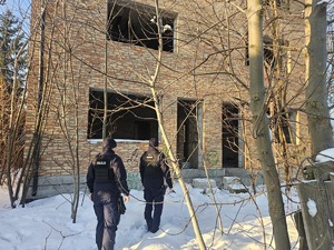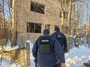 Policjanci sprawdzający pustostan na ul. Płońskiej w Ciechanowie -