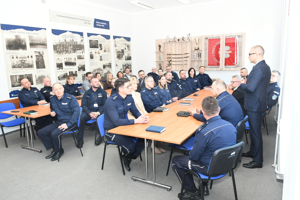 Podczas spotkania głos zabrał również Prokurator Rejonowy w Ciechanowie Przemysław Bońkowski, który podziękował zarówno Komendantowi, jak i wszystkim funkcjonariuszom za wspólną pracę na rzecz poprawy bezpieczeństwa i porządku publicznego naszego powiatu