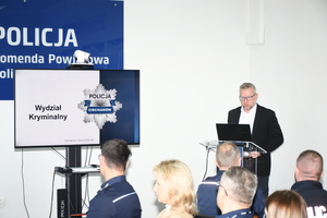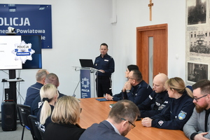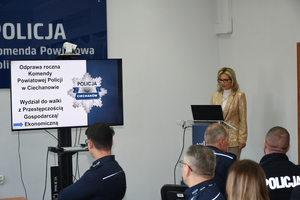Następnie policjanci kadry kierowniczej przedstawili dane podsumowujące pracę funkcjonariuszy poszczególnych pionów Komendy Powiatowej Policji - Wydziału Kryminalnego, Wydziału ds. Walki z Przestępczością Ekonomiczną, Wydziału Prewencji, Wydziału Patrolowo-Interwencyjnego i Wydziału Ruchu Drogowego.