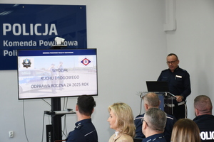 Na wstępie głos zabrał Komendant Powiatowy Policji w Ciechanowie podinsp. Łukasz Jędrasik, który przedstawił, m.in. obszar działania, strukturę organizacyjną, stan etatowy ciechanowskiej jednostki oraz omówił kluczowe aspekty pracy ciechanowskich policjantów w minionym roku. Komendant podkreślił, że miniony rok był czasem intensywnej służby, w którym policjanci skutecznie dbali o bezpieczeństwo mieszkańców, podejmując liczne działania na rzecz walki z przestępczością i poprawy porządku publicznego. Podinsp. Łukasz Jędrasik zaznaczył, że skuteczność pracy policji to efekt zaangażowania i profesjonalizmu mundurowych, ale także dobrej współpracy ze społecznością lokalną oraz samorządami. Komendant Powiatowy Policji w Ciechanowie w swoim wystąpieniu przedstawił również najważniejsze inwestycje zrealizowane w minionym roku, a także plany i cele na 2026 rok.