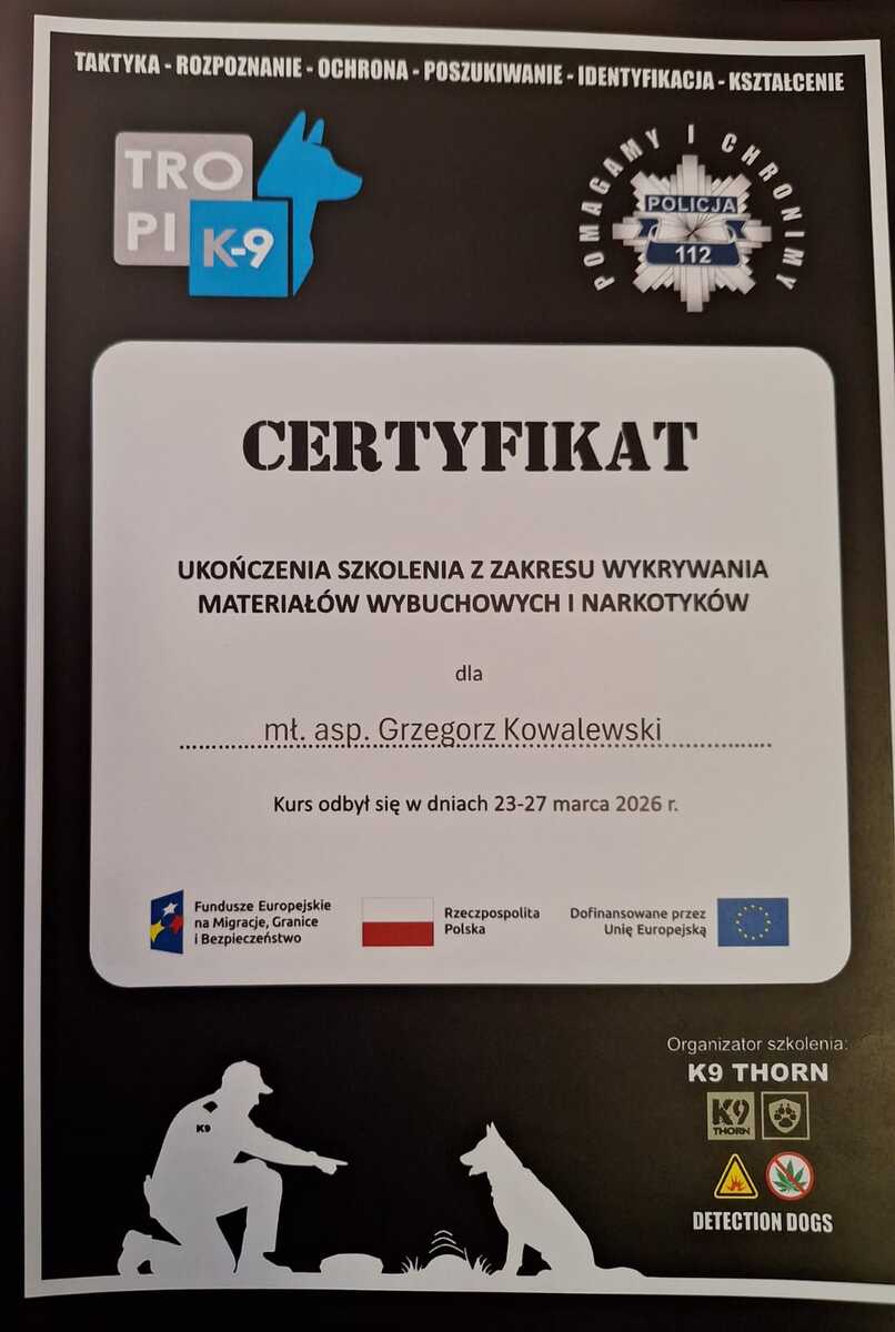 Szkolenie zrealizowane w dniach 23-27 marca 2026 r. dedykowane było przewodnikom i psom służbowym kategorii do wyszukiwania zapachów materiałów wybuchowych oraz do wyszukiwania zapachów narkotyków. Przewodnicy i policyjne psy służbowe z całego kraju, a także ze Straży Granicznej, Służby Więziennej, Krajowej Administracji Skarbowej, Sił Zbrojnych i Policji Litewskiej mieli okazję podnosić swoje umiejętności pod okiem instruktorów - specjalistów w dziedzinie szkolenia psów, posiadających międzynarodowe kwalifikacje. Organizację przedsięwzięcia powierzono firmie „K9 Thorn Ewelina Deputat”, która zapewniła kompleksową usługę szkoleniową. Wziął w nim udział przewodnik psa służbowego z Komendy Powiatowej Policji w Ciechanowie mł. asp. Grzegorz Kowalewski wraz ze swoim podopiecznym Rico.