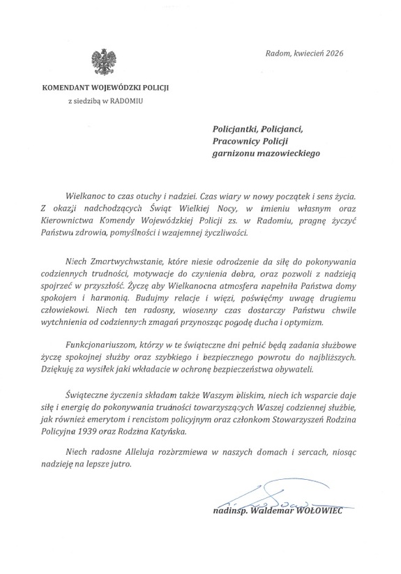 Życzenia od Komendanta Wojewódzkiego Policji zs. w Radomiu z okazji Świąt Wielkanocnych Data publikacji: 03.04.2026