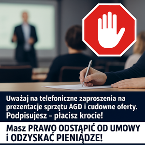 Gostynińscy policjanci ostrzegają przed zaproszeniami telefonicznymi na pokazy „sprzętów gospodarstwa domowego” i innych produktów, podczas których uczestnikom podsuwa się do podpisu kosztowne umowy. Przypominają, że w wielu przypadkach przysługuje prawo odstąpienia od umowy i zwrot pieniędzy, a agresywne techniki sprzedaży są w Polsce nielegalne.
