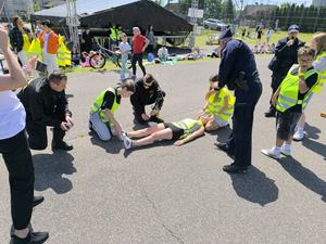Zwieńczeniem wydarzenia był konkurs, podczas którego uczestnicy musieli zmierzyć się z inscenizacjami zdarzeń drogowych, w których poszkodowanymi byli rowerzyści, piesi czy użytkownicy hulajnóg. Zadaniem dzieci było odpowiednie reagowanie i zastosowanie zasad udzielania pierwszej pomocy, zgodnie z tym, czego nauczyli się wcześniej podczas zajęć profilaktycznych.