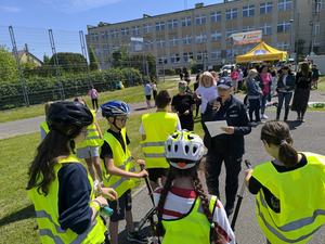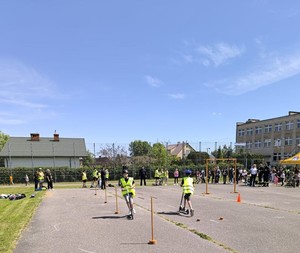 Po części oficjalnej i teoretycznej, uczniowie przenieśli się na szkolne boisko, gdzie przygotowano specjalny tor przeszkód. Tam dzieci miały okazję sprawdzić w praktyce swoje umiejętności jazdy na rowerze, hulajnodze i rolkach, jednocześnie utrwalając zdobytą wiedzę o bezpiecznym poruszaniu się w ruchu drogowym. Rada Rodziców wychodząc naprzeciw zabawom sportowym dzieci, przygotowała odpowiedni zasób energii w postaci owoców czy owocowych sheików.