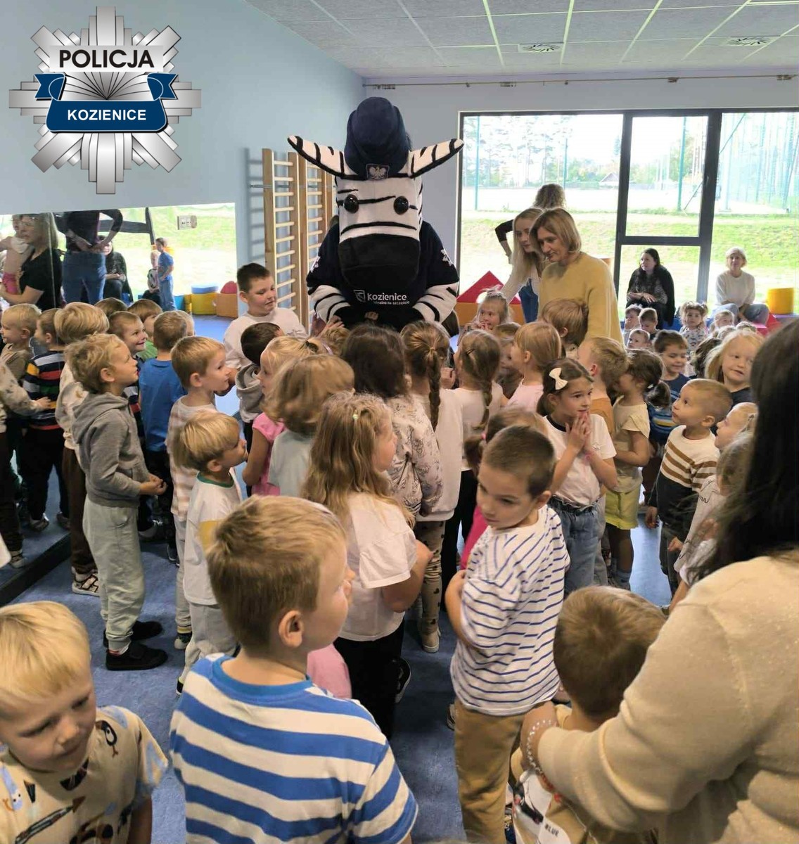 Dziś (24.09) policjanci z Komendy Powiatowej Policji w Kozienicach odwiedzili przedszkolaków z Publicznego Przedszkola nr 1 i 3, prezentując nową maskotkę – zebrę. Spotkanie poświęcone było zasadom bezpieczeństwa w ruchu drogowym.