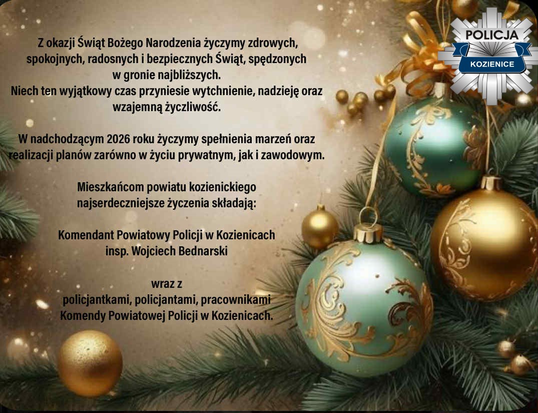 Życzenia Komendanta Powiatowego Policji w Kozienicach z okazji Świąt Bożego Narodzenia Data publikacji 22.12.2025 Powrót Drukuj