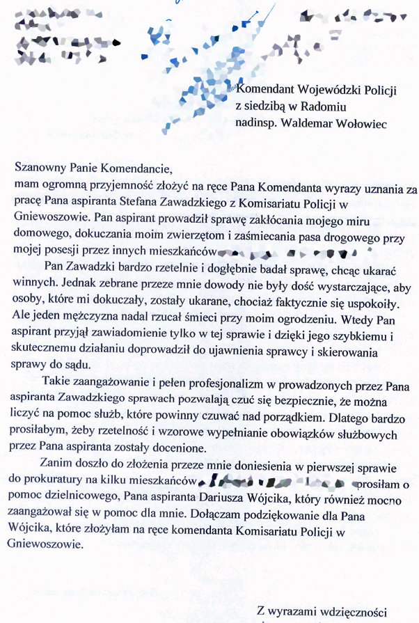 List z podziękowaniami został skierowany na ręce Komendanta Wojewódzkiego Policji zs. w Radomiu nadinsp. Waldemara Wołowca i Komendanta Powiatowego Policji w Kozienicach insp. Wojciecha Bednarskiego i dotyczy pracy asp. Stefana Zawadzkiego oraz asp. Dariusza Wójcika - dzielnicowego z Komisariatu Policji w Gniewoszowie.