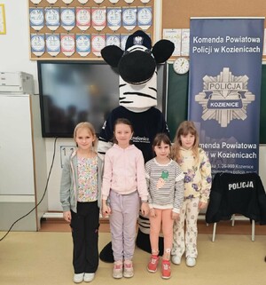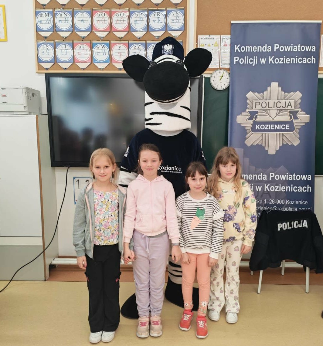 Miłym akcentem spotkania, szczególnie dla najmłodszych, była wizyta maskotki Komendy Powiatowej Policji w Kozienicach – zebry Ziko. Policyjna maskotka wzbudziła duże zainteresowanie i szybko zdobyła sympatię uczniów. Na zakończenie spotkania dzieci mogły przybić z Ziko symboliczną „piątkę”, co wywołało wiele radości i uśmiechów.