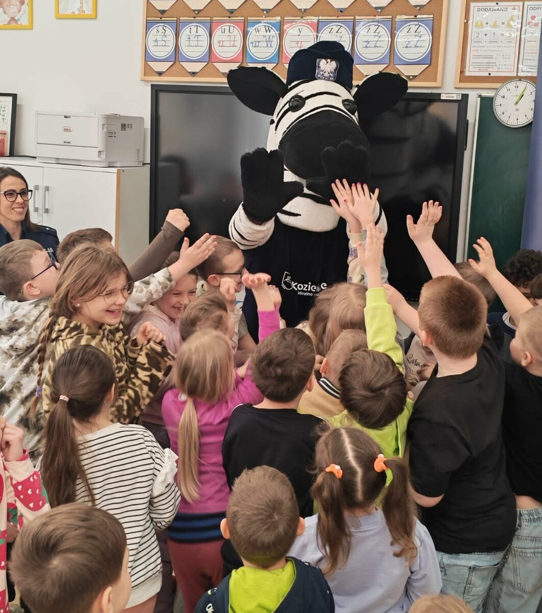 Policjanci z Komendy Powiatowej Policji w Kozienicach spotkali się z uczniami szkół podstawowych w Wysokim Kole i Gniewoszowie, aby rozmawiać o bezpieczeństwie, odpowiedzialności prawnej nieletnich oraz właściwych postawach społecznych. W zajęciach uczestniczyli zarówno młodsi, jak i starsi uczniowie, a spotkaniom towarzyszyła również wyjątkowa maskotka – zebra Ziko.