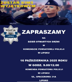 Zachęcamy wszystkich, którzy chcą dowiedzieć się więcej na temat służby w Policji oraz co należy zrobić, żeby zostać policjantem. Zainteresowanych zapraszamy 16 października 2025 roku godzinach 09:00 – 12:00 do wzięcia udziału w dniu otwartych drzwi Komendy Powiatowej Policji w Lipsku.