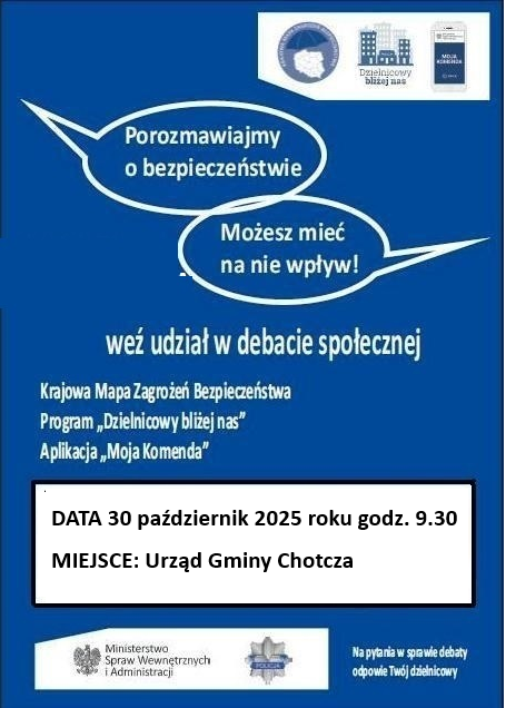 Komendant Powiatowy Policji w Lipsku insp. Witold Krawczyk zaprasza mieszkańców gminy Chotcza na gminną debatę społeczną pn."Porozmawiajmy o bezpieczeństwie - możesz mieć na nie wpływ". Debata odbędzie się 30 października 2025 roku o godz. 9:30 w Urzędzie Gminy w Chotczy.