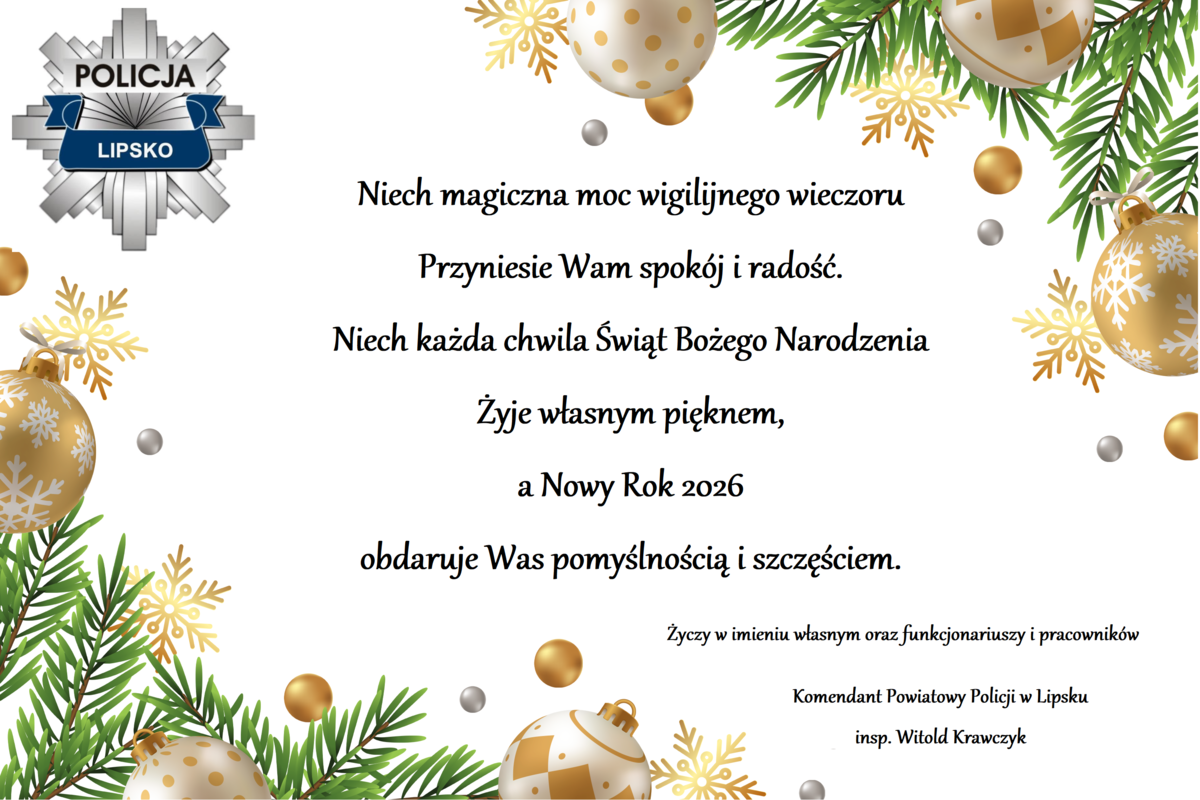 Życzenia Komendanta Powiatowego Policji w Lipsku z okazji Świąt Bożego Narodzenia Data publikacji 22.12.2025 Powrót Drukuj