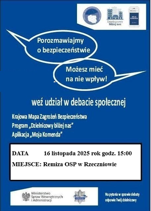 Komendant Powiatowy Policji w Lipsku insp. Witold Krawczyk zaprasza mieszkańców gminy Rzeczniów na gminną debatę społeczną pn."Porozmawiajmy o bezpieczeństwie - możesz mieć na nie wpływ". Debata odbędzie się 16 listopada 2025 roku o godz. 15:30 w Remizie Ochotniczej Straży Pożarnej w Rzeczniowie.