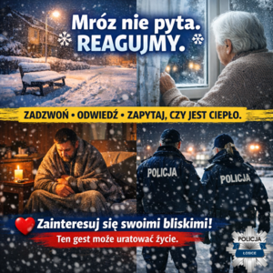 Zwracamy się z apelem do wszystkich rodzin, sąsiadów i opiekunów: zainteresujcie się swoimi bliskimi, którzy mogą być narażeni na skutki niskich temperatur. Nie zakładajmy, że „skoro nie dzwonią, to wszystko w porządku”. Cisza bywa sygnałem ostrzegawczym. Jeśli ktoś mieszka sam, choruje, ma problemy z poruszaniem się lub ogrzewaniem mieszkania nie zostawiajmy go bez wsparcia. Pomoc udzielona na czas może uratować życie. Reagujmy. To nasza wspólna odpowiedzialność Zwracajmy uwagę także na osoby przebywające na zewnątrz na klatkach schodowych, w pustostanach, altankach czy na przystankach. Jedno zgłoszenie, jedna reakcja, jedno zainteresowanie może zrobić różnicę. Mróz nie wybiera. Nie pyta o wiek, status ani sytuację życiową.Dlatego w czasie zimy bądźmy uważni na innych szczególnie na tych najbliżej nas.Bo najgroźniejsze bywają nie same niskie temperatury, lecz obojętność.