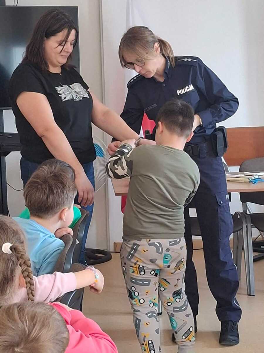 Nie zabrakło również części praktycznej. Przedszkolaki miały okazję zobaczyć z bliska policyjny sprzęt wykorzystywany w służbie, co wzbudziło wiele emocji i radości. Każde dziecko otrzymało także elementy odblaskowe.