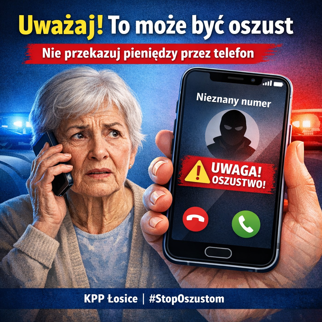 Jeden telefon może kosztować dorobek całego życia. Przestępcy nie odpuszczają i stale modyfikują swoje metody działania, wykorzystując zaufanie, emocje i pośpiech. Mieszkańcy powiatu łosickiego, w szczególności osoby starsze, wciąż znajdują się w grupie szczególnego ryzyka. Dlatego apelujemy o czujność i rozwagę w kontaktach telefonicznych oraz internetowych.
