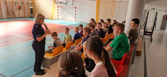 Policjantka na spotkaniu z uczniami Szkoły Podstawowej w Krasińcu. Celem tego spotkania było przypomnienie podstawowych zasadach bezpieczeństwa.