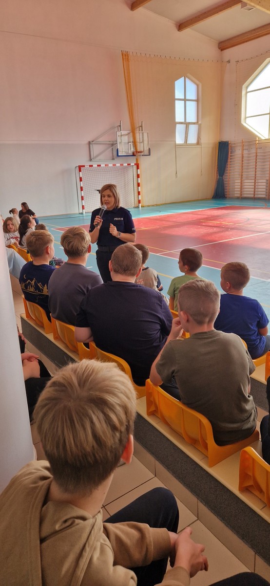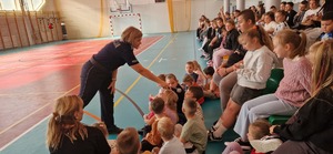Policjantka na spotkaniu z uczniami Szkoły Podstawowej w Krasińcu. Celem tego spotkania było przypomnienie podstawowych zasadach bezpieczeństwa.