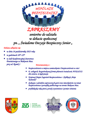 Z okazji Dnia Seniora serdecznie zapraszamy na Debatę Społeczną pn. „Świadome Decyzje Bezpieczny Senior” odbędzie się 16 października 2025 roku w godz. 10:00 – 12:00 w sali konferencyjnej Starostwa Powiatowego w Makowie Mazowieckim.