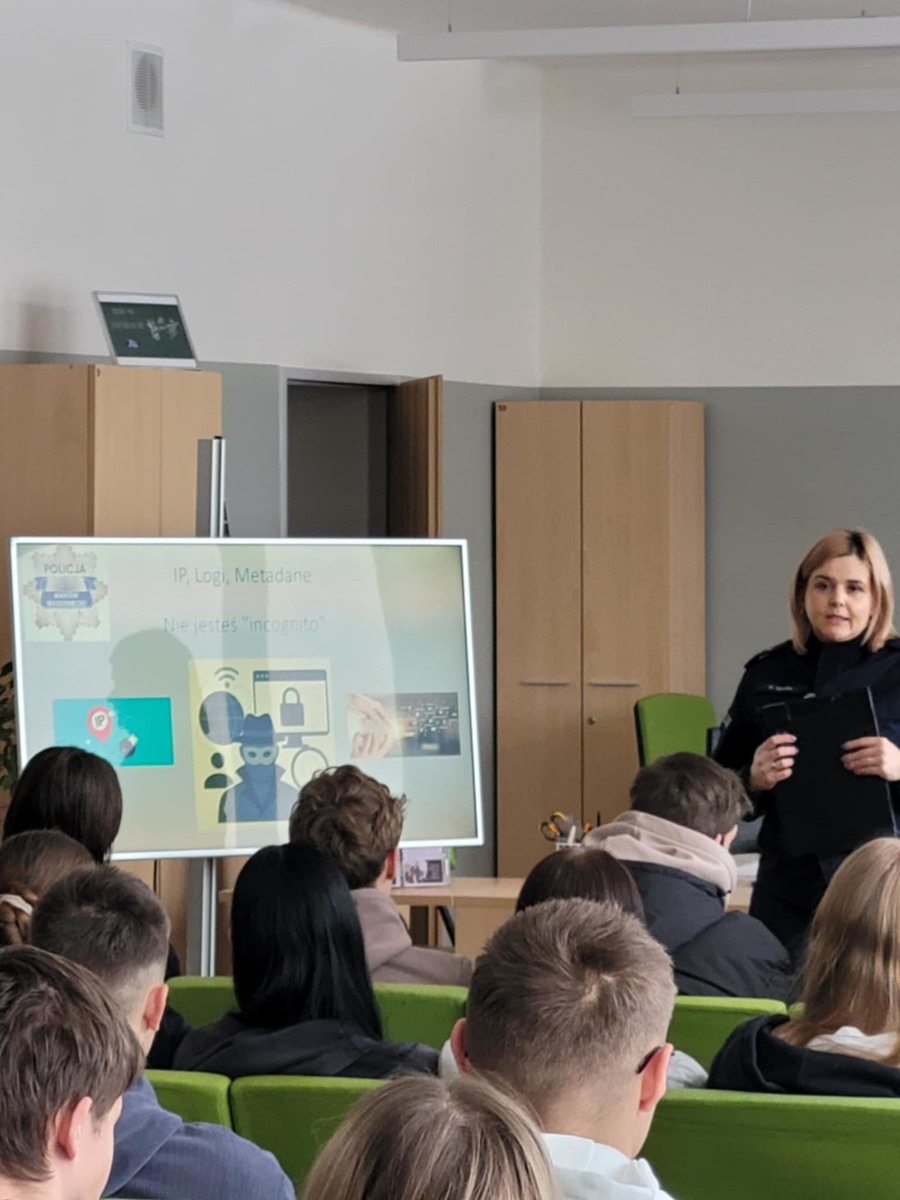 W ramach obchodów Dnia Bezpiecznego Internetu w Zespole Szkół odbyło się spotkanie młodzieży z funkcjonariuszem Policji, poświęcone tematyce cyberbezpieczeństwa. Podczas prelekcji uczniowie dowiedzieli się, jak bezpiecznie korzystać z Internetu, jakie zagrożenia mogą czyhać w sieci oraz jak reagować na cyberprzemoc i inne niebezpieczne sytuacje online.
