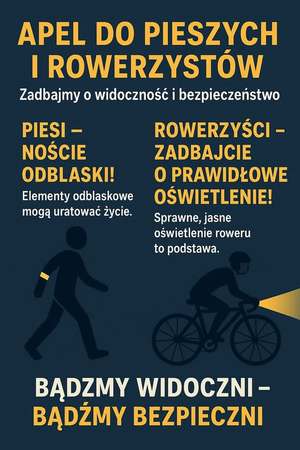 W związku z tym zwracamy się z gorącą prośbą do właśnie tych użytkowników dróg o zadbanie o swoje bezpieczeństwo i widoczność w tym trudnym okresie jesiennym w porze nocnej.