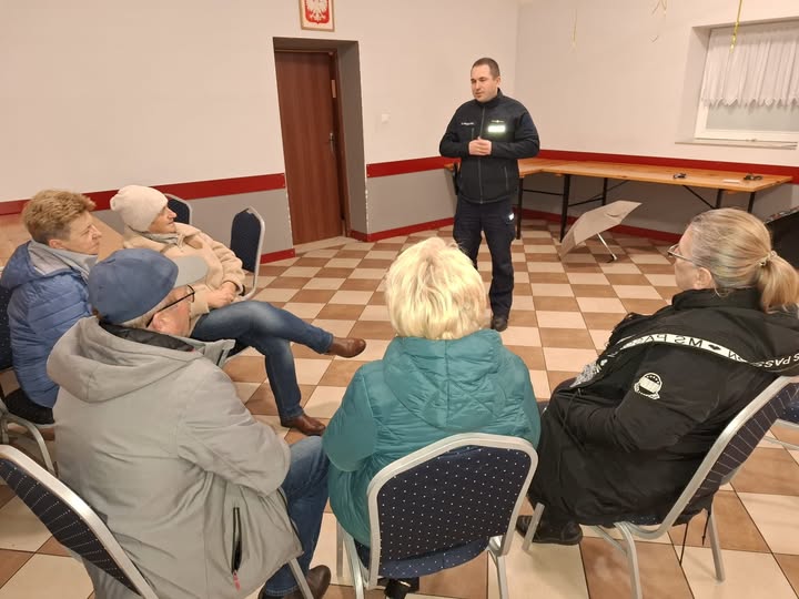 Mundurowi omówili metody działania oszustów na które narażone są osoby starsze oraz mieszkańcy mniejszych miejscowości m.in: "na policjanta", "na wnuczka" czy "wyjątkowe oferty z niższymi opłatami za energię".