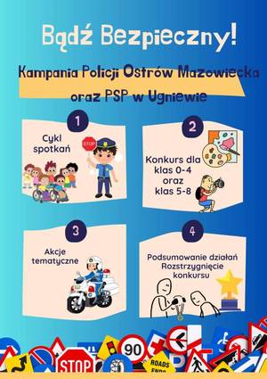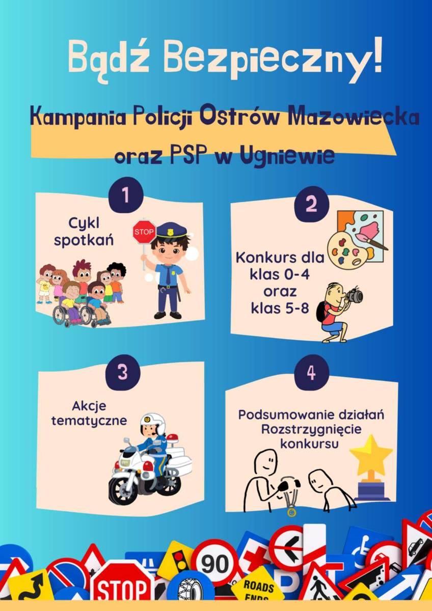 "Bądź bezpieczny" to kampania prowadzona przez Zespół Profilaktyki Społecznej, Nieletnich i Patologii skierowanej do uczniów szkoły podstawowej. Tematem kampanii było bezpieczeństwo w domu, na jezdni oraz w Internecie.