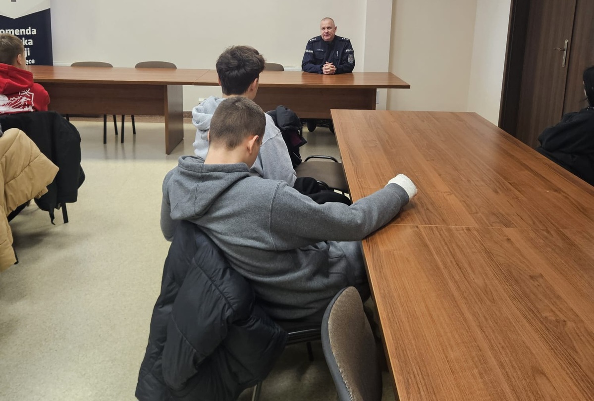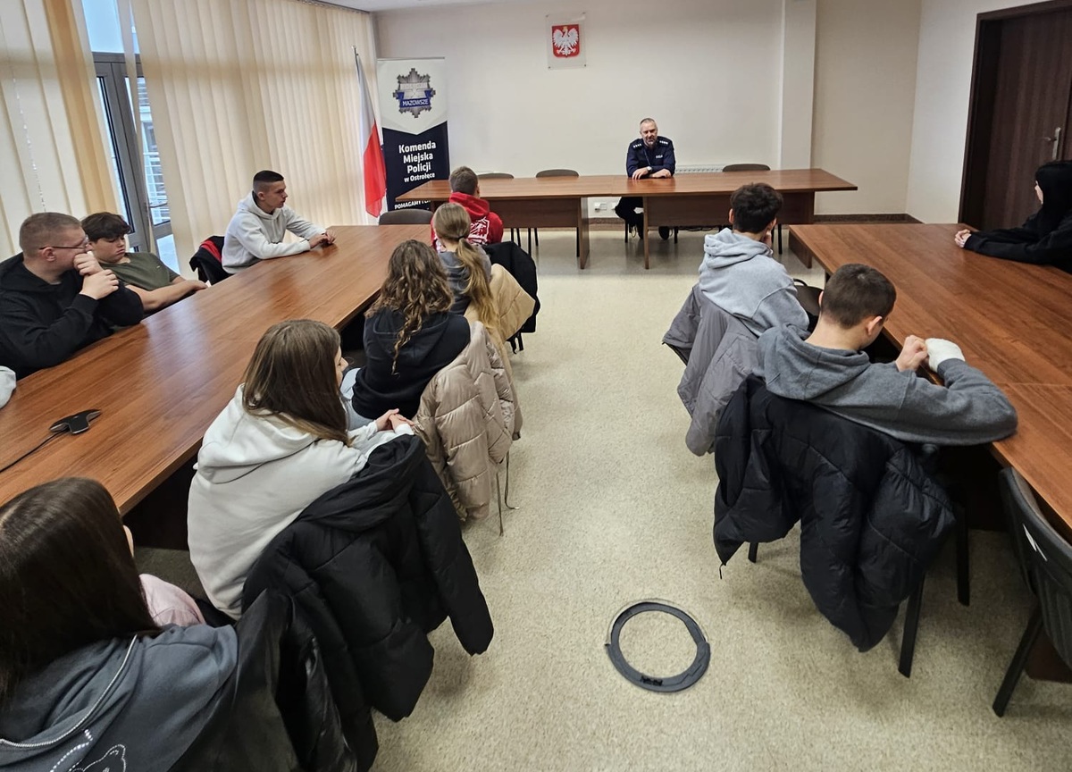 „Dzień z Prewencją” - ostrołęccy policjanci spotkali się z uczniami klas mundurowych w swojej siedzibie