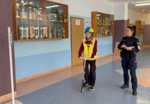 Następnie przyszedł czas na część praktyczną. Najmłodsi mogli spróbować swoich sił, jeżdżąc na hulajnodze. Policjanci przy użyciu specjalnej maty imitującej przejście dla pieszych przypomnieli, jak prawidłowo pokonywać przejścia, zarówno jako pieszy, jak i kierujący hulajnogą.