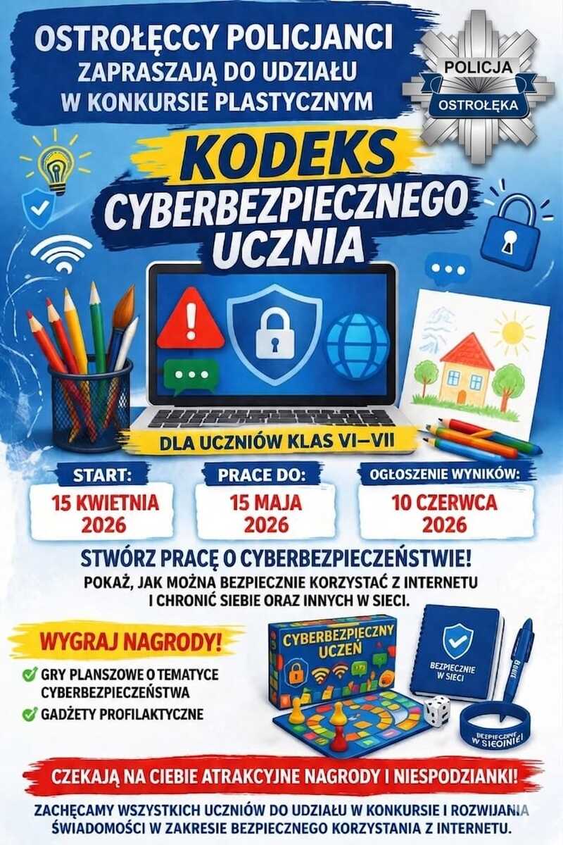 Policjanci z Ostrołęki zachęcają uczniów klas VI i VII szkół podstawowych z terenu Ostrołęki i powiatu ostrołęckiego do udziału w konkursie plastycznym poświęconym tematyce cyberbezpieczeństwa. Inicjatywa ma na celu promowanie bezpiecznych zachowań w sieci wśród młodzieży. Rozpoczęcie konkursu nastąpi 15 kwietnia bieżącego roku. Dla zwycięzców czekają nagrody i niespodzianki.