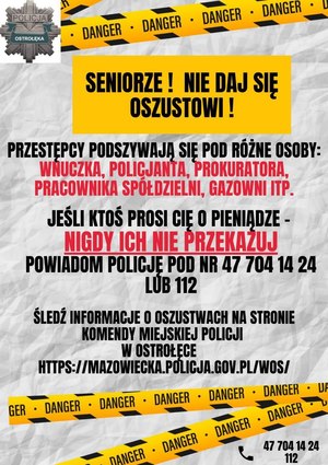 Policjanci z Ostrołęki apelują o czujność i przypominają: nigdy nie przekazuj pieniędzy obcym osobom podających się za członków rodziny, policjantów, czy innych funkcjonariuszy. Dziś około południa odnotowano próbę oszustwa seniorki metodą na wnuczka. Na szczęście kobieta nie dała się oszukać i rozłączyła połączenie nie podając żadnych swoich danych, ani pieniędzy. Za pierwszym takim telefonem są kolejne, dlatego prosimy o ostrzeżenie seniorów przed takimi telefonami i wskazanie im jak mają się zachować w takiej sytuacji. Dobrym sposobem na uniknięcie zagrożenia jest ustalenie rodzinnego hasła, dzięki któremu będziemy mieli 100% pewności, że rozmawiamy z naszą rodziną, a nie oszustami.
