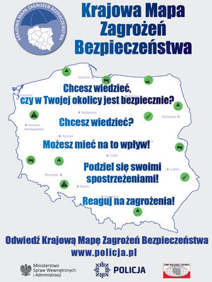 Krajowa Mapa Zagrożeń Bezpieczeństwa to mobilne narzędzie, dzięki któremu przy pomocy komputera lub telefonu, można w prosty i anonimowy sposób przyczynić się do poprawy bezpieczeństwa. Zgłoszenia naniesione na mapę trafiają do policjantów, którzy bezpośrednio zajmują się rozwiązaniem wskazanego problemu. Jeśli widzisz, że w Twojej okolicy dzieje się coś niepokojącego zareaguj i zgłoś to na mapie. Dzięki temu możemy dotrzeć do jak największej liczby mieszkańców, poznać ich problemy i oczekiwania, bo przecież wspólnie możemy więcej!