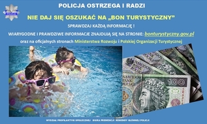 - UWAGA! OSZUSTWA METODĄ „NA BON TURYSTYCZNY” Pomimo trwających wakacji, a więc okresu, kiedy z radością możemy korzystać z letniego wypoczynku, oszuści starają się wykorzystać nasz dobry nastrój i uśpioną ostrożność. Pojawia się coraz więcej doniesień medialnych dotyczących oszustw metodą „na bon turystyczny”. Polski Bon Turystyczny to forma wsparcia finansowego polskich rodzin z dziećmi, a także krajowej branży turystycznej. Został wprowadzony przez polski rząd w związku z trudną sytuacją tego sektora wywołaną epidemią Covid-19.