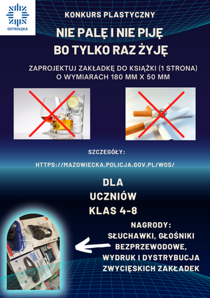 Policjanci z ostrołęckiego Wydziału Prewencji zorganizowali dla dzieci i młodzieży konkurs plastyczny „Nie palę i nie piję bo tylko raz żyję”. W ramach konkursu jego uczestnicy wykonają prace plastyczne w formie zakładek do książki (jednostronne) o wymiarach 180 mm x 50 mm na.Temat prac plastycznych to: „Nie palę i nie piję bo tylko raz żyję”. Konkurs rozpoczyna się 30 listopada 2022 r i potrwa do 23 grudnia 2022 r. Do wygrania atrakcyjne nagrody w postaci, m.in. słuchawek i głośników bezprzewodowych. Fundatorem nagród jest Wójt Gminy Lelis Pan Stefan Prusik. W załączniku znajdziemy regulamin konkursu wraz ze wszystkimi niezbędnymi informacjami dotyczącymi konkursu
