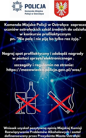 PRZYPOMINAMY: Ostrołęccy policjanci z Wydziału Prewencji przygotowali dla uczniów szkół średnich z Ostrołęki konkurs pod nazwą „NIE PALĘ I NIE PIJĘ BO TYLKO RAZ ŻYJĘ”. Celem konkursu jest przedstawienie (za pomocą nagranego 1-2 minutowego spotu) zdrowego trybu życia, wolnego od alkoholu i nikotyny oraz ukazanie problematyki uzależnień od alkoholu, i nikotyny. Poniżej załączamy regulamin konkursu oraz oświadczenie uczestnika. Zachęcamy uczniów do wzięcia udziału w konkursie. Dla zwycięzców będą przygotowane nagrody w postaci sprzętu elektronicznego o łącznej wartości 4 tysięcy złotych.