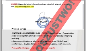 Ponownie odnotowujemy dużą aktywność oszustów, którzy za pomocą poczty e-mail podszywają się pod policjantów Centralnego Biura Śledczego Policji. Zachowajmy szczególną ostrożność, bo przestępcy tylko czekają na nasz błąd!