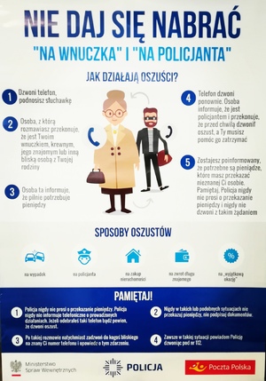 - UWAGA NA OSZUSTÓW PODSZYWAJĄCYCH SIĘ POD POLICJANTÓW Oszuści podający się za policjanta i pracownika banku zadzwonili wczoraj do mieszkańców naszego powiatu. Udało im się wprowadzić w błąd 48-latkę i 19-latka, przez co stracili oni ze swoich kont kilka tysięcy złotych. Otrzymujemy sygnały, że przestępcy dzwonią również dzisiaj do mieszkańców Ostrołęki i powiatu ostrołęckiego. Nie dajmy się oszukać. Informujmy o takich przypadkach Oficera Dyżurnego Komendy Miejskiej Policji w Ostrołęce dzwoniąc pod numer 47-704-14-24. Apelujemy o ostrożność!