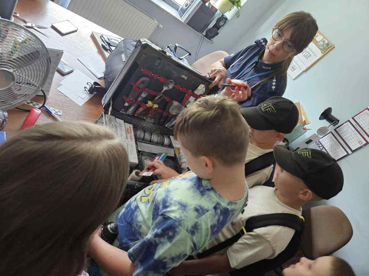 Nasi Goście mieli okazję obejrzeć z bliska, jak wygląda codzienna służba funkcjonariuszy oraz zwiedzić zakamarki płockiej jednostki. Dużym zainteresowaniem cieszył się policyjny sprzęt, który dzieci mogły nie tylko zobaczyć, ale także przymierzyć. Jednym z punktów programu było spotkanie z technikiem kryminalistyki, który opowiedział najmłodszym o swojej ciekawej i odpowiedzialnej pracy. Dzieci miały mnóstwo pytań i z zaciekawieniem słuchały opowieści o zbieraniu śladów, zabezpieczaniu dowodów oraz pracy na miejscu zdarzenia. Wiele emocji wzbudziła możliwość pobrania własnych odcisków palców. Podczas wizyty nie mogło zabraknąć rozmów o bezpieczeństwie – szczególnie teraz, gdy trwają wakacje. Policjanci przypomnieli dzieciom podstawowe zasady bezpiecznego zachowania na drodze, nad wodą oraz podczas spędzania czasu na świeżym powietrzu. Spotkanie odbyło się w ramach działań profilaktycznych prowadzonych w ramach akcji Kręci mnie bezpieczeństwo w lecie.