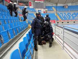 Zgodnie ze scenariuszem, podczas meczu piłki ręcznej w Orlen Arena pomiędzy kibicami zwaśnionych drużyn doszło do nieporozumienia. Kibice drużyny gości zaczęli rzucać przedmiotami, niszczyć wyposażenie obiektu oraz używać słów wulgarnych w stosunku do kibiców drużyny miejscowej. Podczas meczu doszło do niekontrolowanego odpalenia środków pirotechnicznych , które grupa kibiców nielegalnie wniosła na obiekt. Seria wybuchów spowodowała panikę wśród uczestników wydarzenia. Część miejscowych kibiców próbowała uciec z trybun chcąc uniknąć konfrontacji. Podczas ucieczki dwie osoby doznały urazu w postaci poparzenia twarzy oraz złamania otwartego kończyny dolnej. Z uwagi na eskalację zagrożenia oraz niewystarczającą ilość sił i środków ochrony oraz brak możliwości udzielenia pomocy poszkodowanym, na wniosek organizatora, na teren imprezy został wprowadzony pododdział zwarty policji w celu przywrócenia naruszonego porządku publicznego i zapewnienia bezpieczeństwa uczestnikom meczu oraz osobom poszkodowanym.
